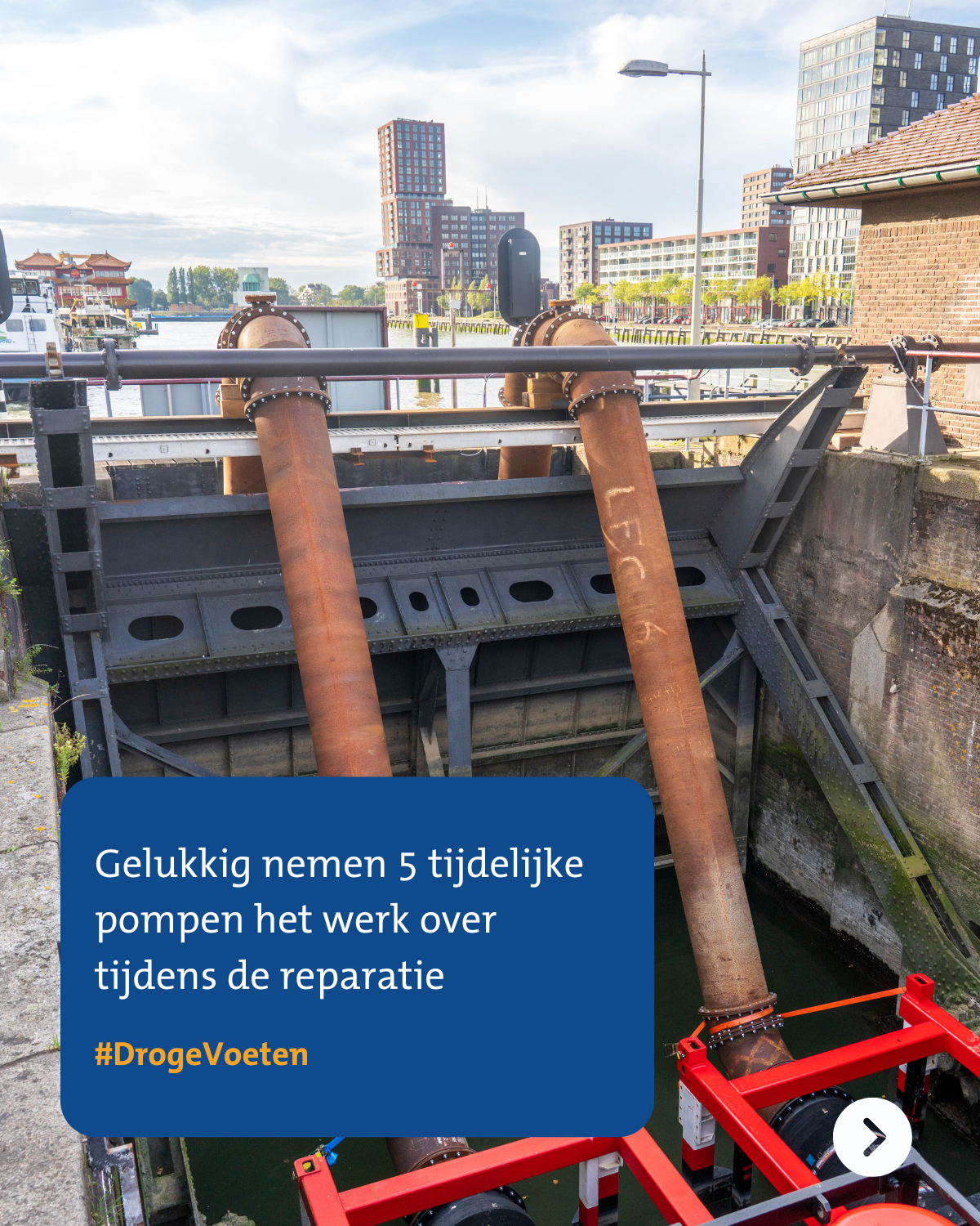 Gemaal Parksluizen is het grootste gemaal van Delfland en we kunnen niet zonder die waterreus. Daarom plaatsen we tijdelijke pompinstallaties die het werk overnemen. Er zijn maar liefst vijf grote pompinstallaties nodig om de capaciteit van gemaal Parksluizen te vervangen. Ze laten je goed zien wat normaal verborgen zit in het gebouw.