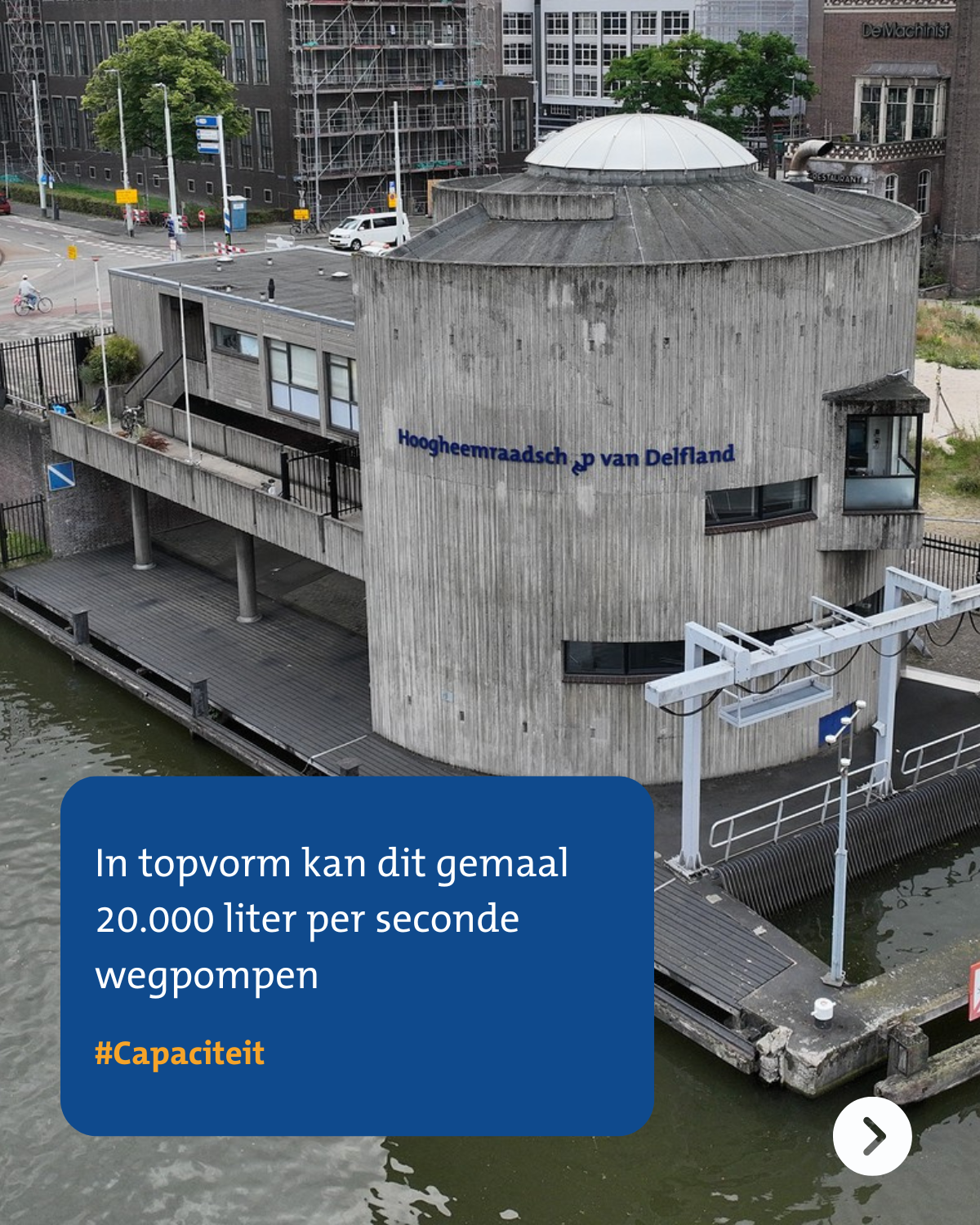 Heb je je ooit afgevraagd hoe het komt dat je droge voeten houdt, zelfs als het keihard regent? Dat is het werk van gemalen. Bij de Parksluizen in Rotterdam staat het grootste gemaal van Delfland: gemaal Parksluizen. Dit gemaal pompt het teveel aan water weg als onze sloten en vaarten het niet meer aankunnen. Zo werken we aan het voorkomen van wateroverlast.