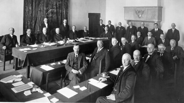 Eerste vergadering van het algemeen bestuur, met Willem Drees als VV-lid.