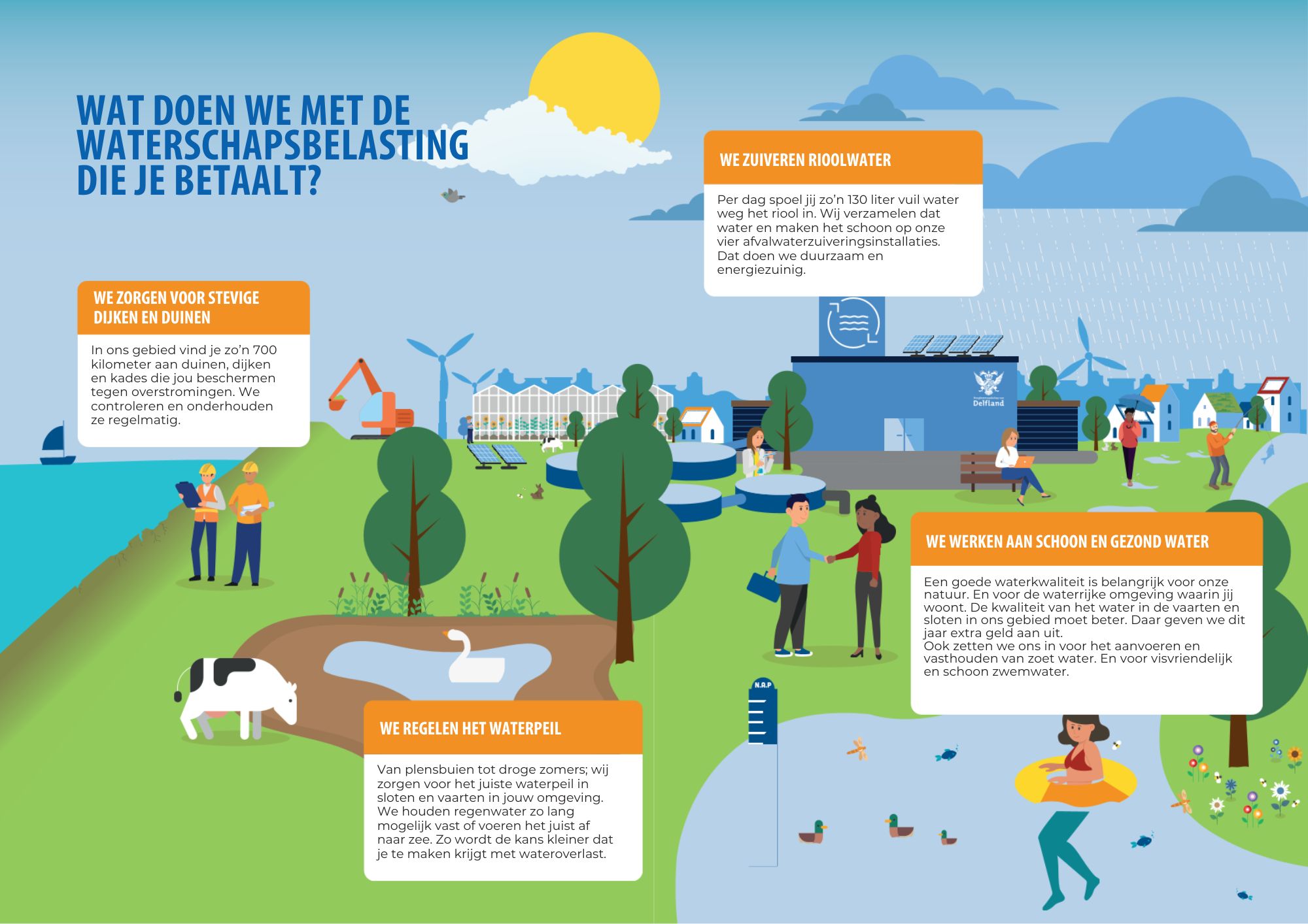 Om het waterrijke gebied van Delfland veilig en leefbaar te houden. Dat doen we door elke dag aan stevige dijken en duinen te werken en te zorgen voor schoon en voldoende oppervlaktewater. En we passen ons gebied aan op de verwachte zeespiegelstijging, op lange periodes van droogte en op plotselinge wateroverlast. Dat zijn dure werkzaamheden, die ook steeds duurder worden. Om die werkzaamheden ieder jaar te kunnen betalen, heffen we waterschapsbelasting.