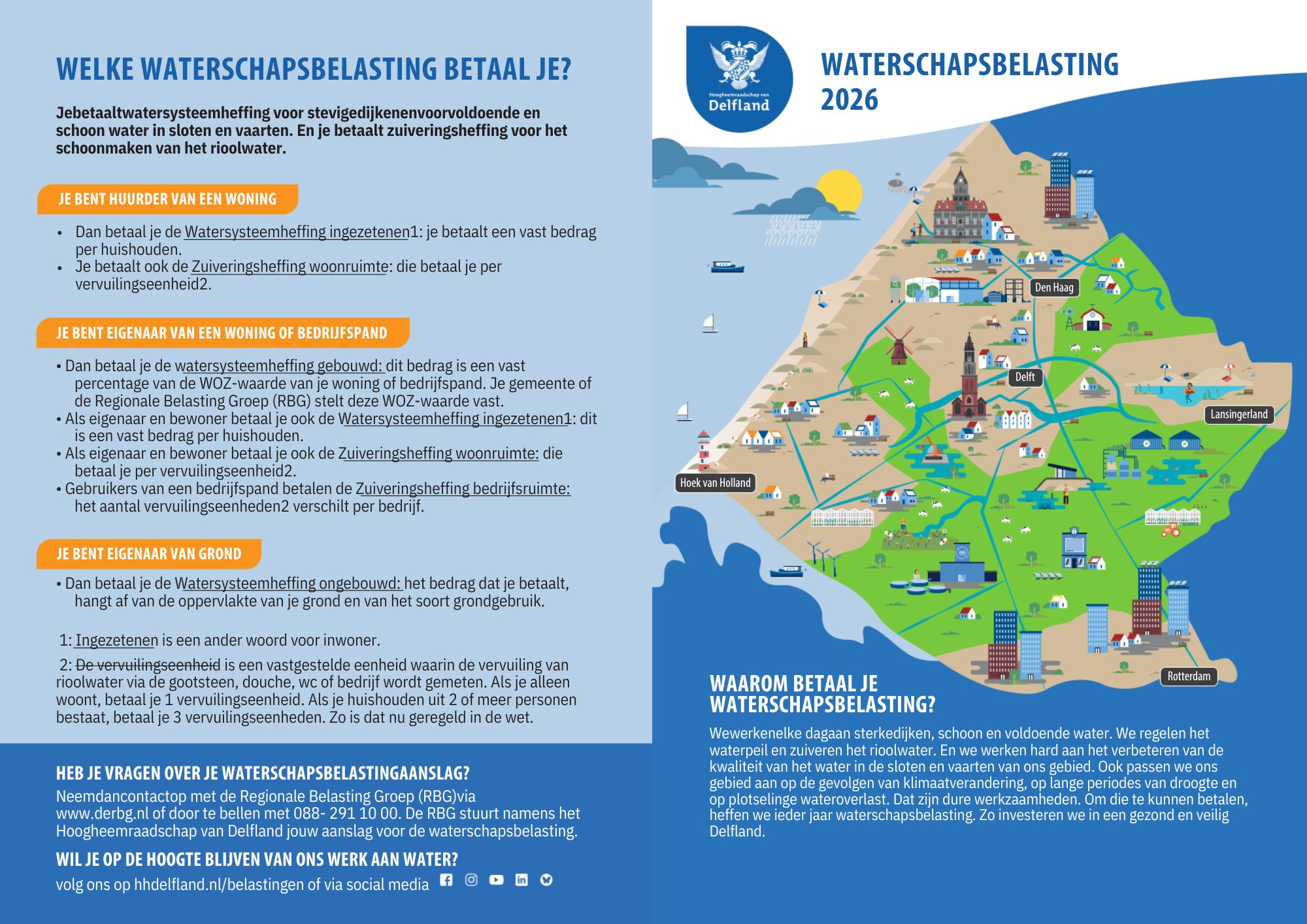 Ook in 2026 investeert het Hoogheemraadschap van Delfland in een veilig, schoon en klimaatbestendig gebied, met oog voor de betaalbaarheid en een weerbare regio. Er is kritisch gekeken naar de uitgaven, zonder in te leveren op de kwaliteit. Hierdoor stijgt de waterschapsbelasting voor 2026 met ongeveer 6% ten opzichte van vorig jaar. Delfland zit daarmee op de gemiddelde landelijke stijging.