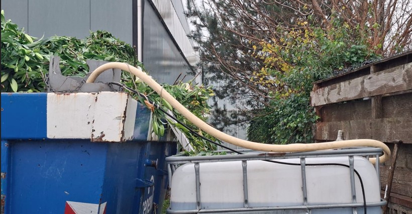 Bij een andere ondernemer zagen we een open container voor afgedragen gewassen. Vanuit die container werd water dat uit de gewassen loopt naar een afgesloten opslagtank gepompt. Hiermee voorkomt hij dat vervuild water via eventuele lekkages naar de bodem loopt, of dat vervuild water over de rand klotst als de container wordt opgehesen.