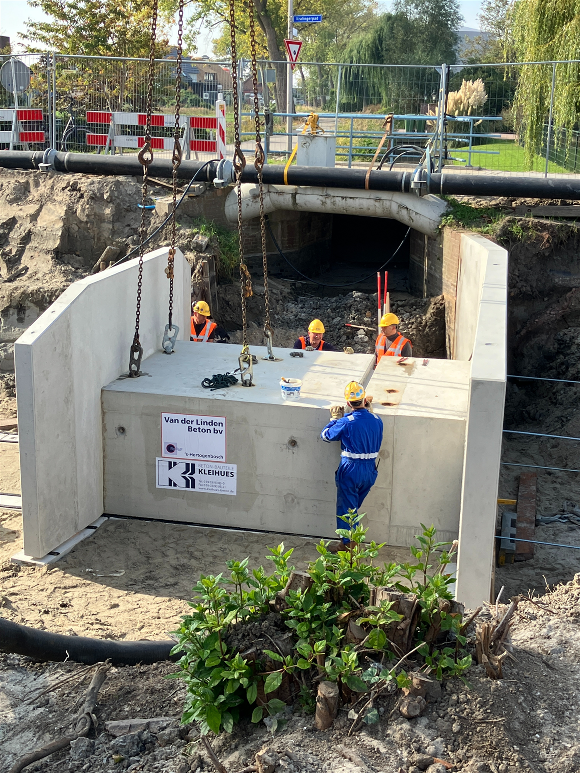 In de week van 1 oktober zijn de duikerelementen met een telekraan op zijn plek gehesen. Daarvoor is de fundering van de duiker met de nodige precieze geplaatst. Een flink staaltje passen en meten om de elementen goed op elkaar te laten aansluiten.
